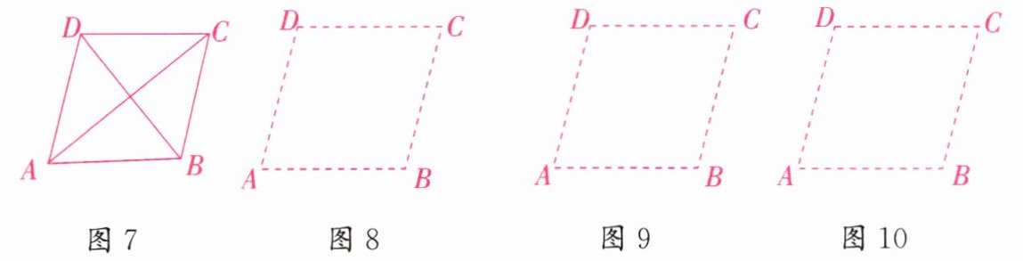 (1)请沿着AC剪一刀,把它分成两部分,把剪开的两部分拼成一个平行四边形,在图8中用实线画出你所拼成的平行四边形;若沿着BD剪开,请在图9中用实线画出你拼成的平行四边形,直接写出这两个平行四边形的周长。
