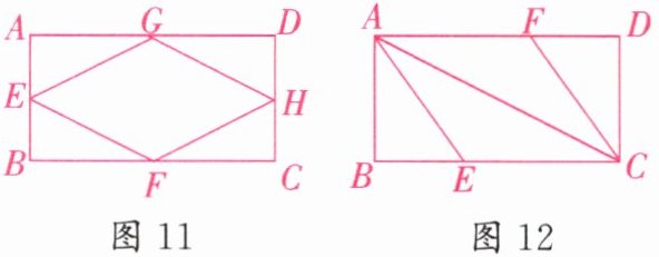 现要求在一张长12cm、宽5cm的矩形纸片上折出一个菱形。小光同学按照取两组对边中点的方法折出菱形EFHG(如图11),小琪同学按照沿矩形的对角线AC折出∠CAE= ∠DAC,∠ACF= ∠ACB的方法得到菱形AECF(如图12)。请你通过计算,比较谁折出的菱形面积大。