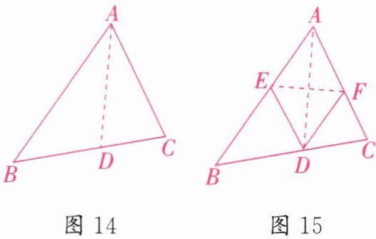 将三角形纸片ABC(AB>AC)沿过点A的直线折叠,使得AC落在AB边上,折痕为AD,展平纸片,如图14。再次折叠该三角形纸片,折痕为EF,再次展平后连接DE,DF,如图15。