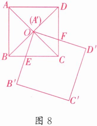 3. 如图8,正方形ABCD的对角线AC,BD相交于点O,正方形A'B'C'D'的顶点A'与点O重合,A'B'交BC于点E,A'D'交CD于点F,若正方形A'B'C'D'绕点O旋转某个角度后,你得到什么结论?
