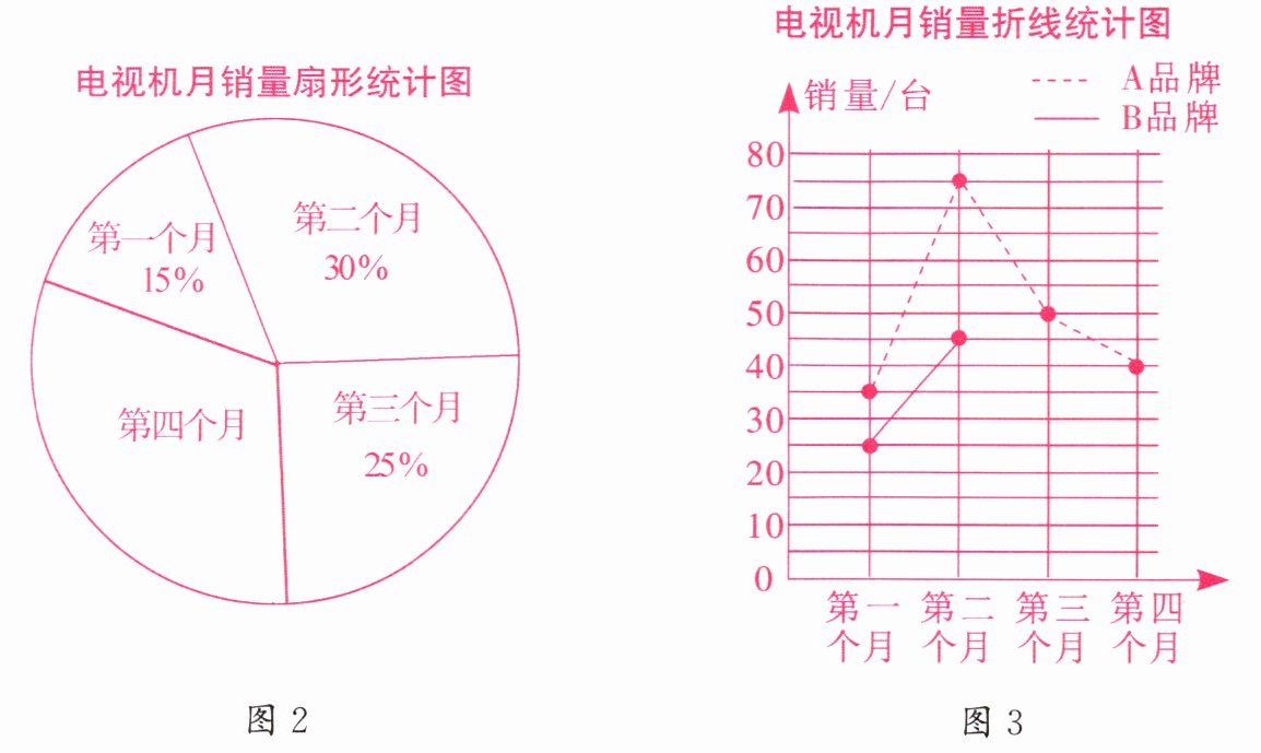 2. 某商店在四个月的试销期内,只销售A,B两个品牌的电视机,共售出400台。试销结束后,只能经销其中的一个品牌,为作出决定,经销人员绘制了两幅统计图,如图2和图3。