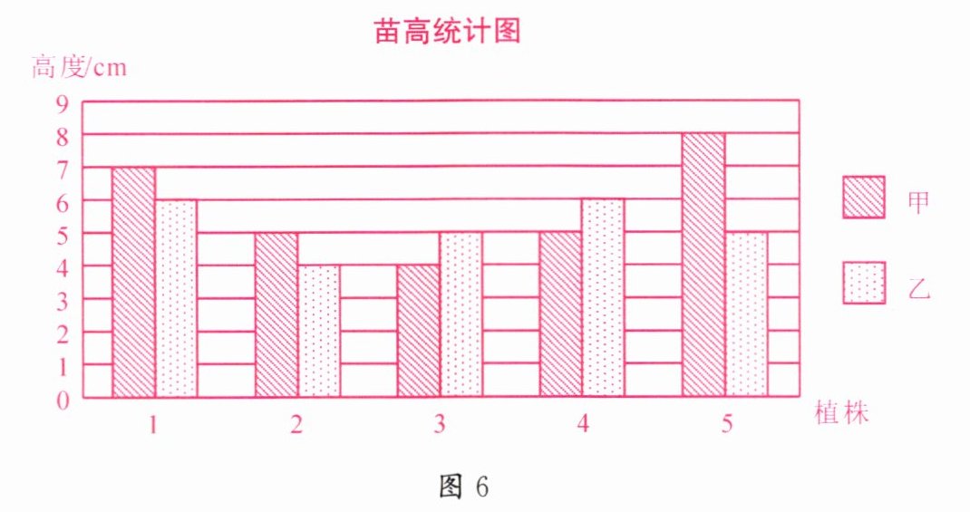 水稻种植是我国的传统农业。为了比较甲、乙两种水稻的长势,农业科技人员从两块试验田中,分别随机抽取5棵植株,将测得的苗高数据绘制成如图6所示的统计图: