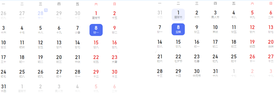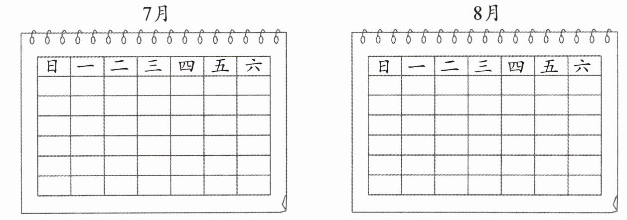 大东的学校从7月5日开始放假。大东做暑假安排前,动手制作了2025年7月和8月的月历,他将暑假的安排标注在了月历上。请你发挥聪明才智,也试着制作一份月历吧!