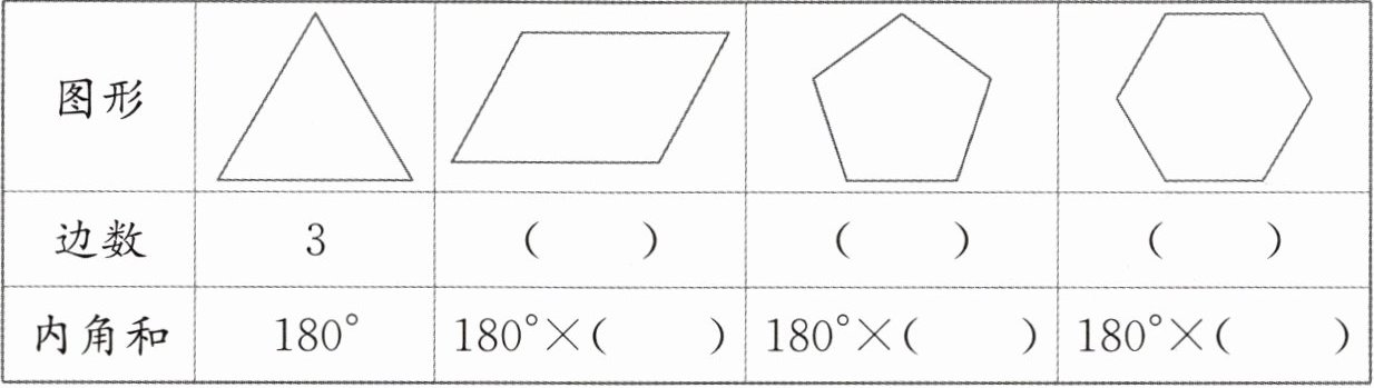(2)$ 180^{\circ} × $(边数 - 2) 2. 八 3. 略。