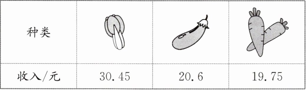 王大爷卖这三种菜一天共收入多少钱?$30.45 + 20.6 + 19.75 = 70.8$(元)