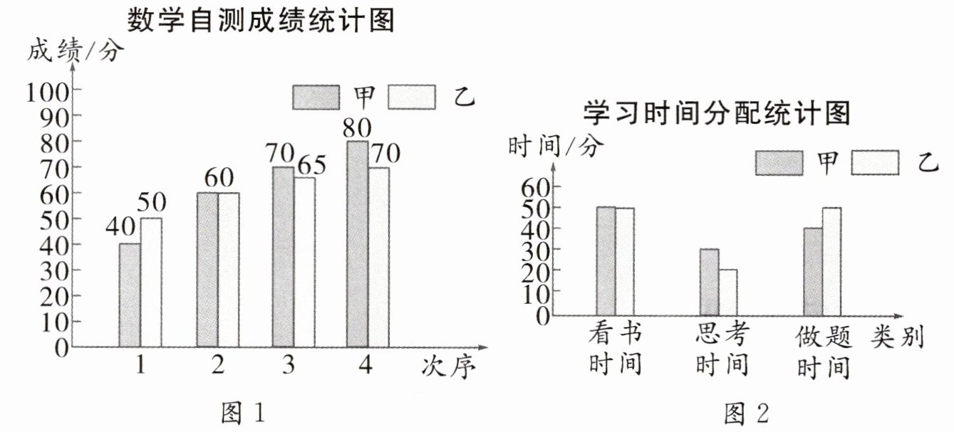 下面两幅统计图反映的是甲、乙两位同学的数学自测成绩和在家学习时间分配情况。