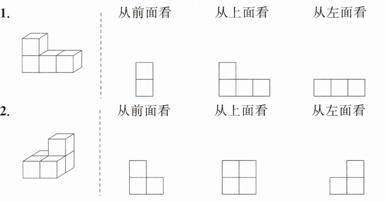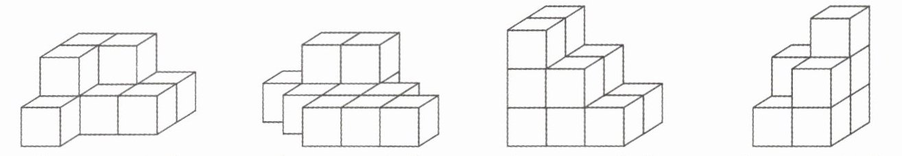 下面的物体至少是由几个小正方体摆成的,填在括号里。