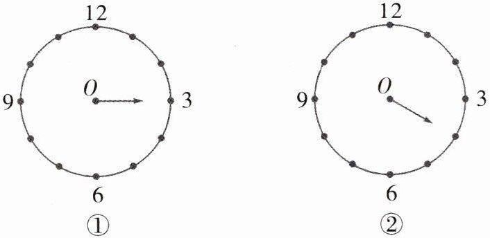 2. 在图①中画出指针从“3”绕点 O 顺时针旋转$60^{\circ }$后所在的位置,在图②中画出指针从“4”绕点 O 逆时针旋转$90^{\circ }$后所在的位置。