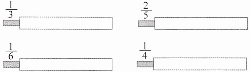 下面的长方形纸条被遮住了一部分,并且露出部分的长度相等,露出部分占长方形纸条的长度如图所示。请你将各纸条画完整,并将最长的纸条圈出来。
