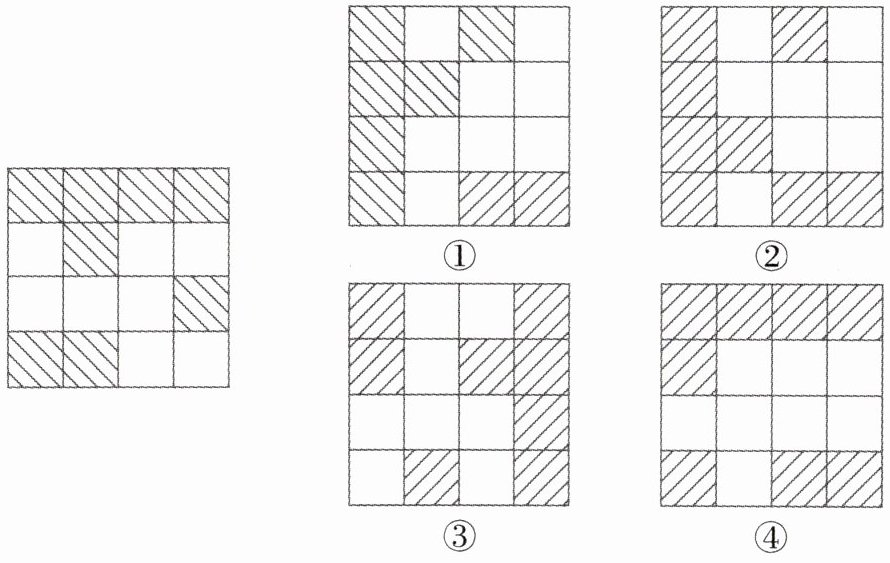 下图中右边标有①、②、③、④的图形,其中一个是左边图形旋转一定角度后得到的。请你找出来。
