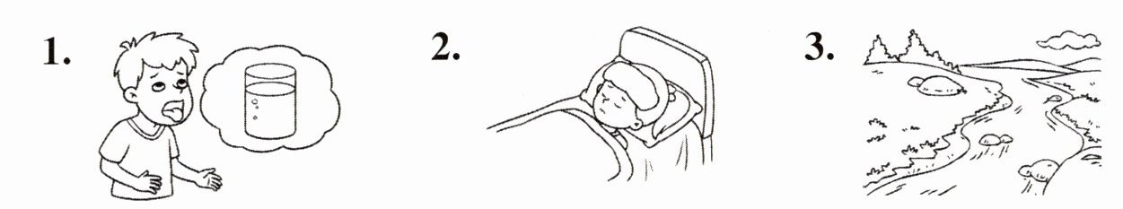 1. 图中显示一个人渴了,想着饮料,对应的单词是“thirsty”。