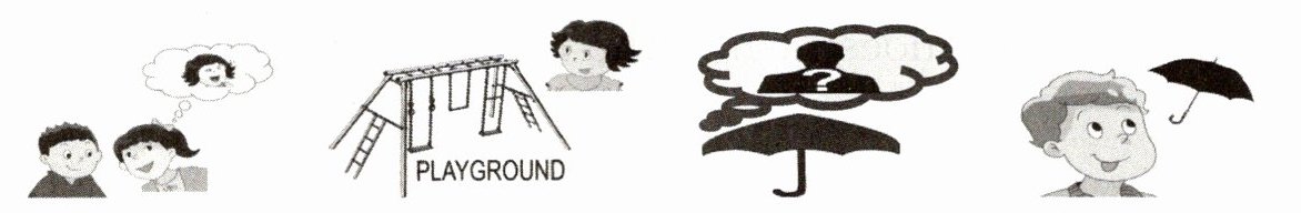 【解析】:对话围绕“这是谁的伞”展开。首先A提出问题“Whose is this umbrella?”,对应图片3(思考伞是谁的);接着B猜测“Is it Mike's?”,对应图片4(男孩和黑色伞,与Mike相关);A否定并说明“Mike's umbrella is black. But this one is red.”;然后B猜测“Is it Yang Ling's? She likes red.”,对应图片1(两人思考并出现女孩头像,与Yang Ling相关);最后A说“Look, Yang Ling is in the playground.”并提议“Let's go and ask her.”,对应图片2(操场场景)。