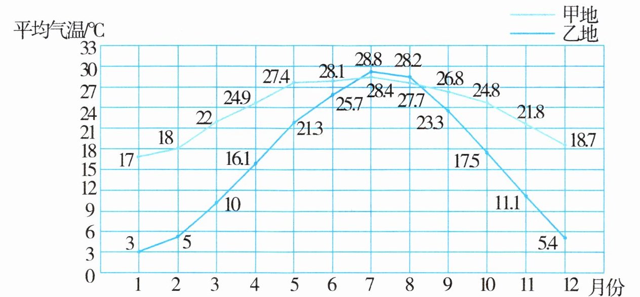 1. 请你说一说甲、乙两地一年中气温变化的趋势。