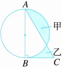 2. 如下图,三角形ABC是直角三角形,AB是圆的直径,且AB长10厘米,涂色乙的面积比涂色甲的面积少6平方厘米。求BC的长是多少厘米。