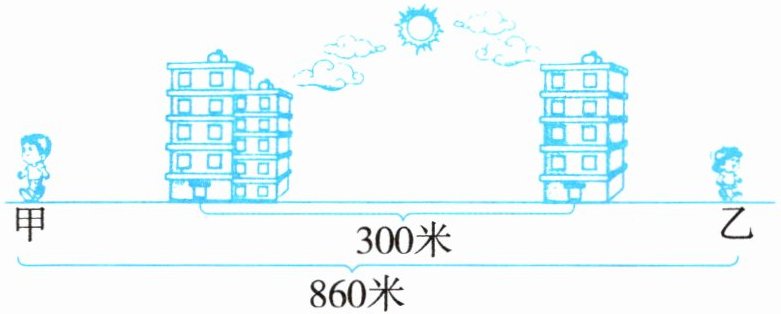 7. 两座大楼相距300米,甲、乙两人分别从两座大楼门口同时向相反的方向走去(如图),7分钟后两人相距860米。甲每分钟走37米,乙每分钟走多少米? (用方程解)