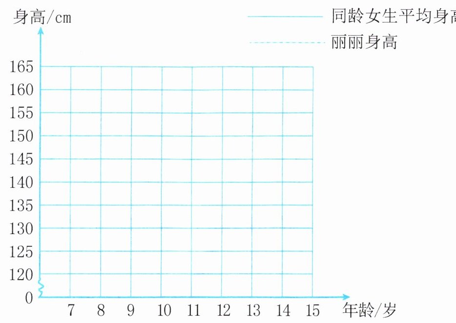 1. (此处需根据数据在给定网格中绘制折线统计图,同龄女生平均身高用实线连接各点(7,125)、(8,130)、(9,136)、(10,144)、(11,150)、(12,154)、(13,158)、(14,160)、(15,162);丽丽身高用虚线连接各点(7,123)、(8,127)、(9,135)、(10,141)、(11,145)、(12,152)、(13,156)、(14,157)、(15,158))