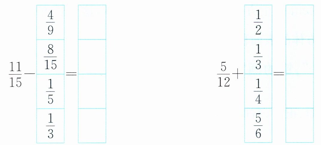 $ \frac{11}{15} - \begin{array}{|l|} \hline \frac{4}{9} \\ \hline \frac{8}{15} \\ \hline \frac{1}{5} \\ \hline \frac{1}{3} \\ \hline \end{array}\\ \hline = $ $ \frac{5}{12} + \begin{array}{|l|} \hline \frac{1}{2} \\ \hline \frac{1}{3} \\ \hline \frac{1}{4} \\ \hline \frac{5}{6} \\ \hline \end{array}\\ \hline = $