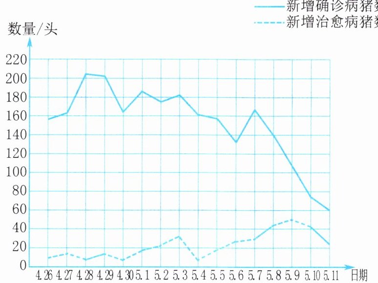 1. 5 11 5 9 2. 疫情得到控制,新增病猪越来越少,治愈病猪数量在增加。
