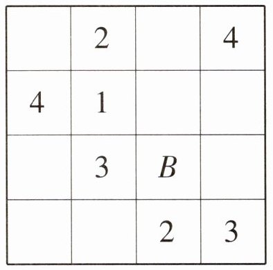 1. 在右面的方格中,每行每列都有1~4这四个数,并且每个数在每行、每列都只出现一次。B应该是几? 其他方格的数你也能填出来吗?