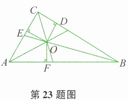 23. 如图所示,在 $ \triangle A B C $中,$ \angle C = 90 ^ { \circ } $,点 O 为 $ \triangle A B C $的三条角平分线的交点,$ O D \perp B C $,$ O E \perp A C $,$ O F \perp A B $,点 D、E、F 分别是垂足,且 $ B C = 8 \mathrm { cm } $,$ C A = 6 \mathrm { cm } $,则点 O 到三边 AB、AC 和 BC 的距离分别等于____cm、____cm 及____cm。