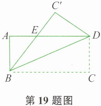 19. 如图所示,矩形 ABCD 沿着直线 BD 折叠,使点 C 落在 $ C ^ { \prime } $处,$ B C ^ { \prime } $交 AD 于点 E,$ A D = 8 $,$ A B = 4 $,则 DE 的长为____。