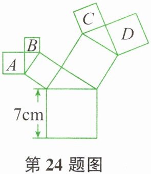 24. 如图所示,所有的四边形都是正方形,所有的三角形都是直角三角形,其中最大的正方形的边长为 7cm,则正方形 A、B、C、D 的面积之和为____$ \mathrm { cm } ^ { 2 } $。