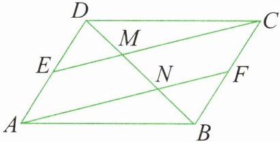 14. 如图所示,$□ ABCD$中,$E$、$F分别为AD$、$BC$的中点,$CE$、$AF分别交BD于M$、$N$。求证:$BN = MN = DM$。