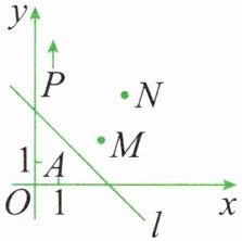 2. 如图所示,已知点 $ A(0,1) $、$ M(3,2) $、$ N(4,4) $,动点 $ P $ 从点 $ A $ 出发,沿 $ y $ 轴以每秒 $ 1 $ 个单位长度的速度向上移动,且过点 $ P $ 的直线 $ l:y = -x + b $ 也随之移动,设移动时间为 $ t $ 秒。