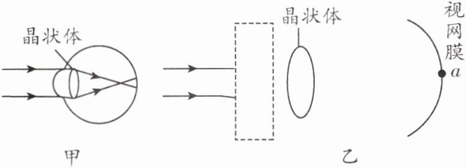 13. (大庆中考)如图甲所示的是近视眼的成像示意图,其中晶状体相当于凸透镜,平行光经过晶状体等结构未会聚在视网膜上。请在图乙虚线框内画出适当的透镜,并将两条光线的光路补充完整,使光线会聚在视网膜上的a点。