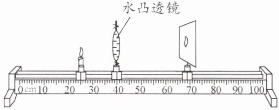 10. (广西中考)(多选)小明用自制的“水凸透镜”探究凸透镜成像的规律,调节“水凸透镜”内水的多少,可以改变“水凸透镜”的形状。当蜡烛、“水凸透镜”和光屏位于如图所示的位置时,光屏上呈现烛焰清晰的像。下列说法正确的是(