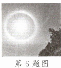6. (黄冈中考)2023年5月13日,湖北省多个地区的人们看到太阳的周围出现一个彩色的光圈,如图所示。这是一种罕见的天象——日晕,它是光透过高空云层中的冰晶