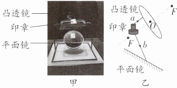 26. (成都中考)如图甲所示是博物馆内“刘充国印”的展台,上方是凸透镜,透过它能看到放大的印章;下方是平面镜,通过它能看到印章底部的字。图乙是其示意图,$ F $ 为凸透镜的焦点,$ O $ 为凸透镜的光心,光线 $ a $ 平行于凸透镜的主光轴(图中虚线)。请在图乙中画出: