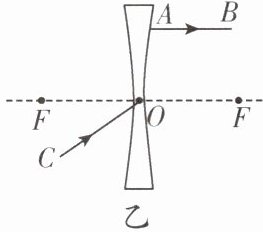 (2) 解:对于图乙,过光心O的光线CO传播方向不变;AB为折射光线,其入射光线平行于凹透镜主光轴且指向凹透镜左侧。(注:此处需根据透镜成像规律在图中准确画出相应光线,文字描述仅辅助说明画图要求)