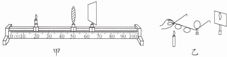 (1)当烛焰、焦距为 10 cm 的凸透镜 $ A $ 位于图甲中的位置时,光屏上得到一个清晰的像,该像是一个倒立、