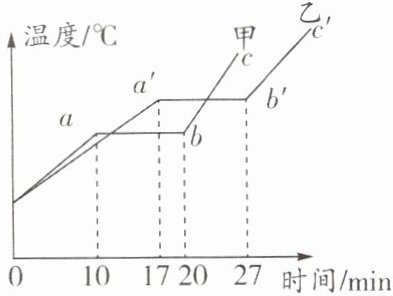 A. 甲熔化时间:20min - 10min = 10min,乙熔化时间:27min - 17min = 10min,相同热源,时间相同,吸热相等,A正确。