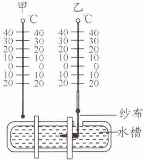 12. (新编)有一种测量空气中水蒸气含量的装置叫作干湿泡温度计。如图所示,它是由两个相同的温度计并列制成的,其中一个温度计的玻璃泡被湿布包起来。两个温度计的读数不一样,湿泡温度计的读数较