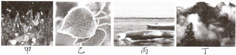 B. 图乙中,树叶上霜的形成是空气中的水蒸气遇冷凝华形成的小冰晶,而不是凝固现象,所以B选项错误。