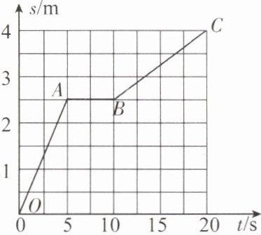 1. 由图像可知,OA段:t₁=5s,s₁=2.5m,速度v₁=s₁/t₁=2.5m/5s=0.5m/s;BC段:t₂=20s-10s=10s,s₂=4m-2.5m=1.5m,速度v₂=s₂/t₂=1.5m/10s=0.15m/s。因为0.5m/s>0.15m/s,所以OA段的速度大于BC段的速度。