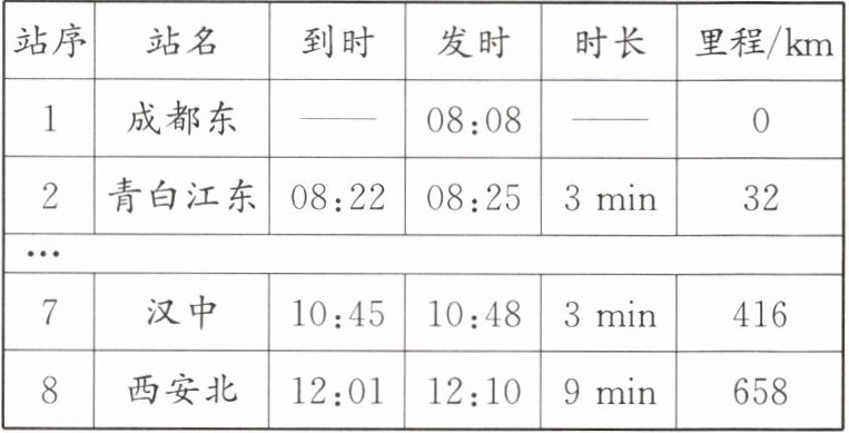 1.(新都区期末)G2204是从成都东开往郑州东的一趟高速列车,其部分运行时刻表如下。G2204从成都东开往西安北的平均速度大约为