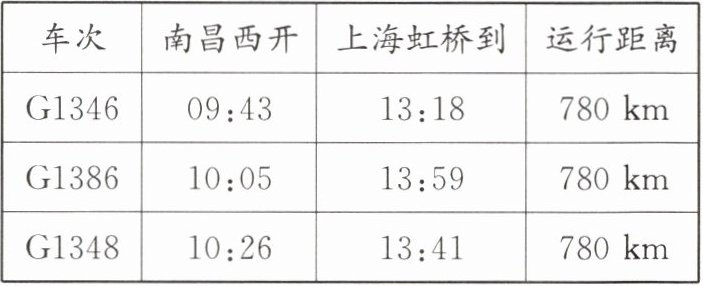 (2)解:G1348次列车南昌西开10:26,上海虹桥到13:41,运行时间$t=13:41 - 10:26=3h15min=3.25h$,运行距离780km,平均速度$v=\frac{s}{t}=\frac{780km}{3.25h}=240km/h$。