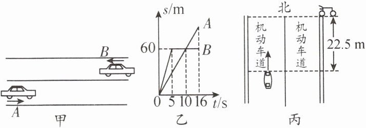 (3)如图丙所示,有两条机动车道,每车道宽3.6m。一辆长为4.5m、宽为1.8m的轿车以54km/h的速度由南向北匀速行驶在左侧机动车道的正中间。此时一辆长为1.8m的自行车突然横穿机动车道,自行车与轿车在南北方向的距离为22.5m,则自行车的车速只有在什么范围内才能避免与这辆轿车相撞?