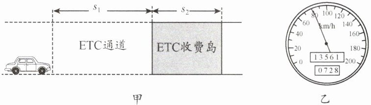 8.(新编)高速公路已广泛应用ETC收费系统,这种系统是对过往车辆无需停车即能实现收费的电子系统。如图甲是某高速公路入口处的ETC通道示意图。现有一辆汽车以如图乙所示的速度匀速行驶,在开始进入ETC通道时减速,经$t_{1}= 8s$后运动至ETC收费岛边界,然后再以18km/h的速度匀速通过ETC收费岛。已知$s_{1}= 50m$,$s_{2}= 35m$,不计车长。求:(计算结果保留一位小数)