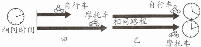 16. (新编)图甲、乙分别表示比较自行车和摩托车运动快慢的两种方法。图甲表明:相同时间内,摩托车运动得远,说明摩托车比自行车运动得
