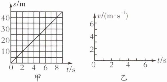 在乙图中,从$t=0$开始,到$t=8s$(或更长时间,因为匀速运动速度不变,图像可延伸),画一条速度为5m/s的水平线。