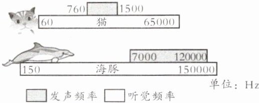 12.(新编)猫和海豚的发声频率和听觉频率如图所示。猫能听到的最高频率的声音比海豚能听到的最高频率的声音要