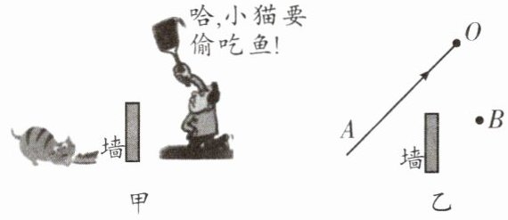10. (成都中考)如图甲,小孟利用一面小镜子隔墙看到院里的小猫要偷吃鱼。如图乙所示,AO表示来自小猫的入射光线,O点为入射点,B点为小孟眼睛所在位置。请在图乙中完成作图: