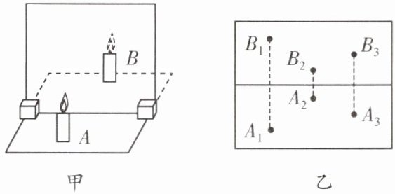 。(3)改变蜡烛A的位置,进行三次实验。用直线将物和像的位置连接起来,如图乙所示,发现物和像的连线与镜面