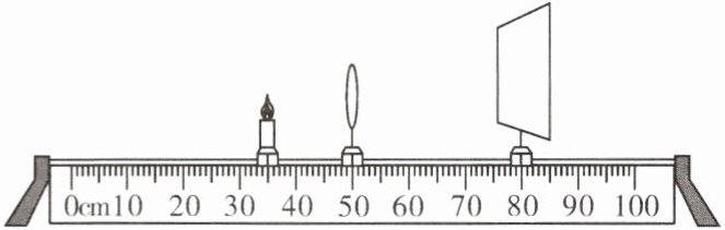 解:由图可知,蜡烛在35cm刻度线处,凸透镜在50cm刻度线处,光屏在80cm刻度线处。