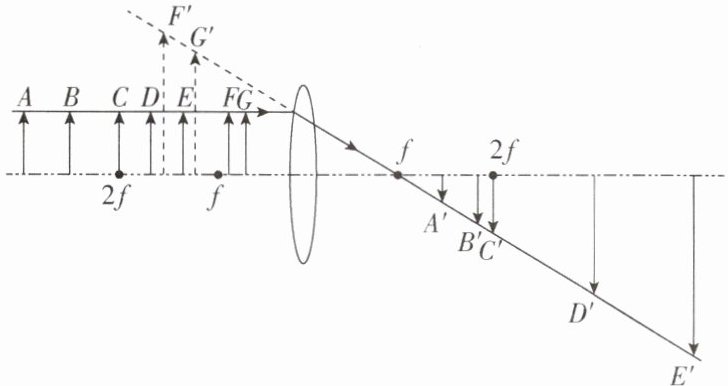 物体分别位于$A$、$B$、$C$、$D$、$E$、$F$、$G$位置时,所成的像分别位于$A'$、$B'$、$C'$、$D'$、$E'$、$F'$、$G'$位置。