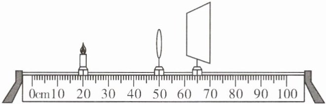 解:由图可知,蜡烛在20.0cm刻度线处,凸透镜在50.0cm刻度线处,光屏在65.0cm刻度线处。